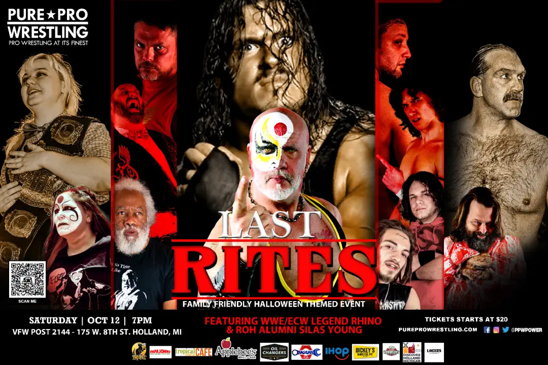 Holland, MI — Get ready for a night of thrilling, high-octane professional wrestling action as Pure Pro Wrestling (PPW) returns to the VFW Post 2144 on Saturday, October 12, 2024! The event, aptly titled “Last Rites,” promises to deliver a night of unforgettable entertainment, drama, and excitement for fans of all ages.